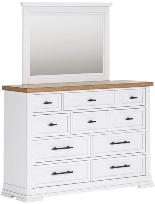 Casual style with substance. This two-tone dresser with mirror raises the bar on comfortably cozy design in your soothing sanctuary. A sturdy silhouette with a classic white finish and black metal hardware exudes modern farmhouse vibes. The butcher block oak veneer top adds a relaxed aesthetic.Read More
