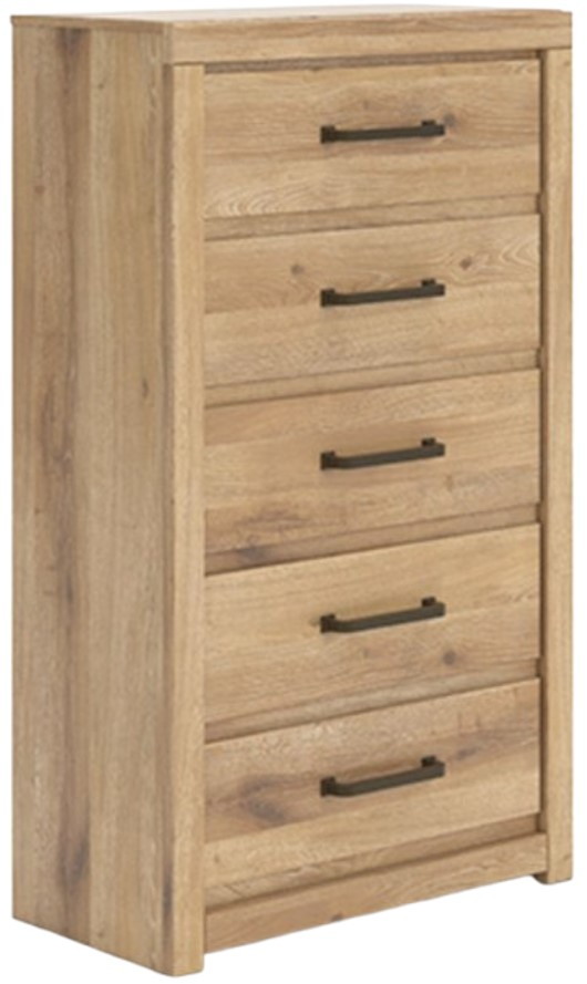 The Brozmont 5 drawer chest features a warm tan finish, clean lines, and spacious drawers that offer practical organization. Its sturdy construction and modern rustic charm make it a stylish addition to any bedroom, blending durability and elegance for everyday use.Read More