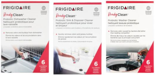 Our Frigidaire ReadyClean™ Probiotic Bundle includes everything you need to keep your appliances clean and performing their best. The bundle includes a box of our ReadyClean™ Probiotic Sink and Disposer Cleaner, Dishwasher Cleaner and Washer Cleaner. Each box contains 6 packets featuring our triple action formulas to safely clean appliances and remove odors caused by bacteria, mold and fungus. Safe for use across all appliance brands.Read More