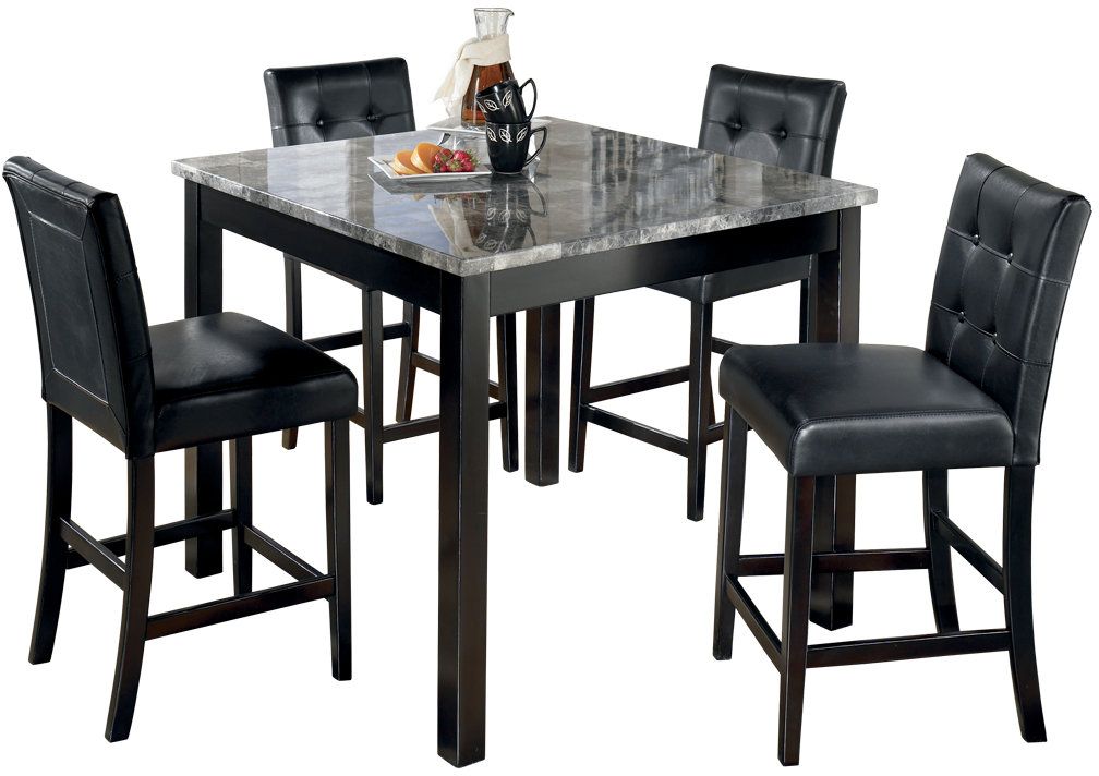 Comfortably dine with the square table and 4 button-tufted, upholstered bar stools of the 5-piece, counter-height, Maysville dining room set. The laminated, faux-marble tabletop and faux-leather chair upholstery show off your high-end, fashionable tastes.