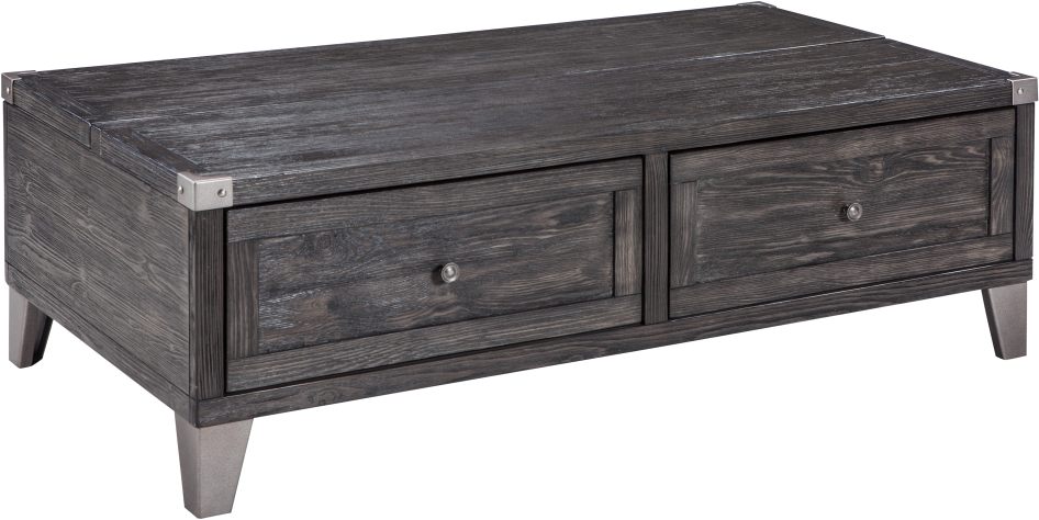 Lift half of the Todoe coffee spring-loaded tabletop for convenient use whenever you need. A fixed cubby, and 2 smooth-gliding drawers with removable trays offer ample storage, while the metal nailhead rivets, knob pulls, and canted legs enhance the style.