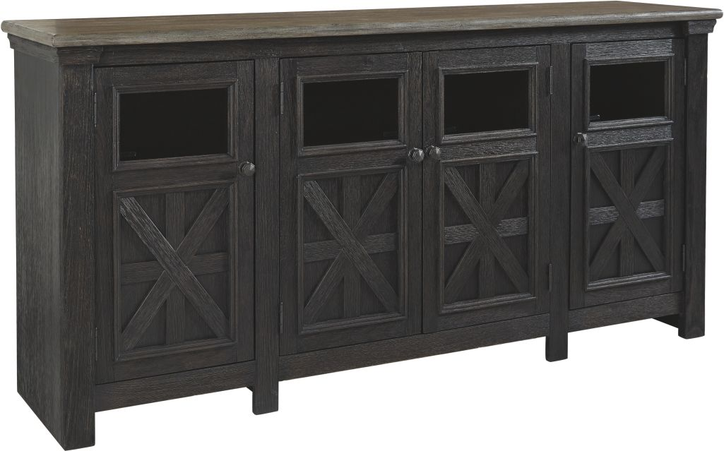 Enhance your entertainment experience with the extra-large Tyler Creek TV stand. Set up to a 74” TV on the weathered top and your gadgets on the 3 adjustable shelves behind the clear, glass-inset doors. The cable cutouts keep wires organized and out of the way.