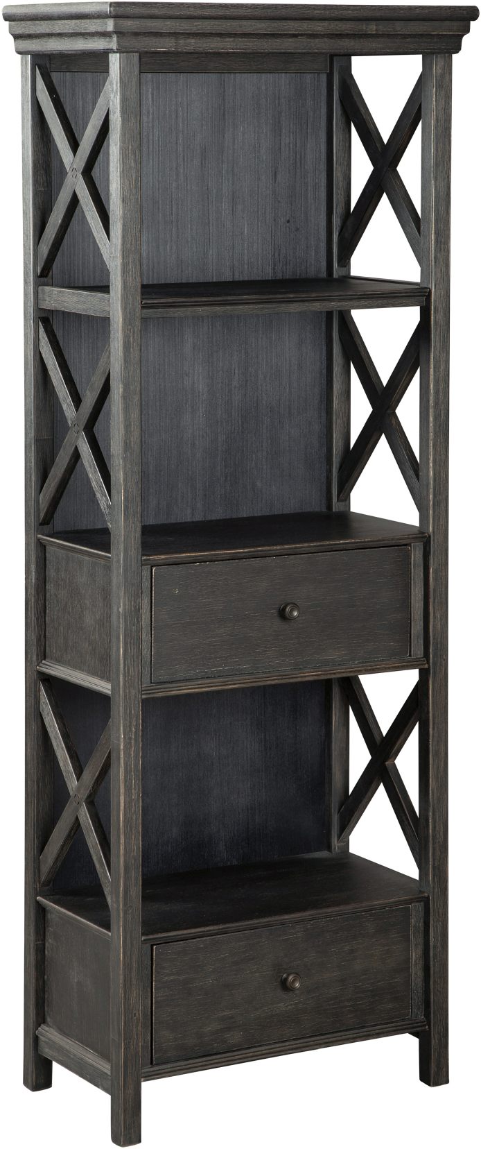 Invite your family into the heart of your home with the Tyler Creek dining room display cabinet. Its black finish is beautifully textured, and an X-shaped design down the sides makes it all around eye-catching. Put your dinnerware and decor on display on the top shelf, and store away essentials inside the roomy drawers.Read More
